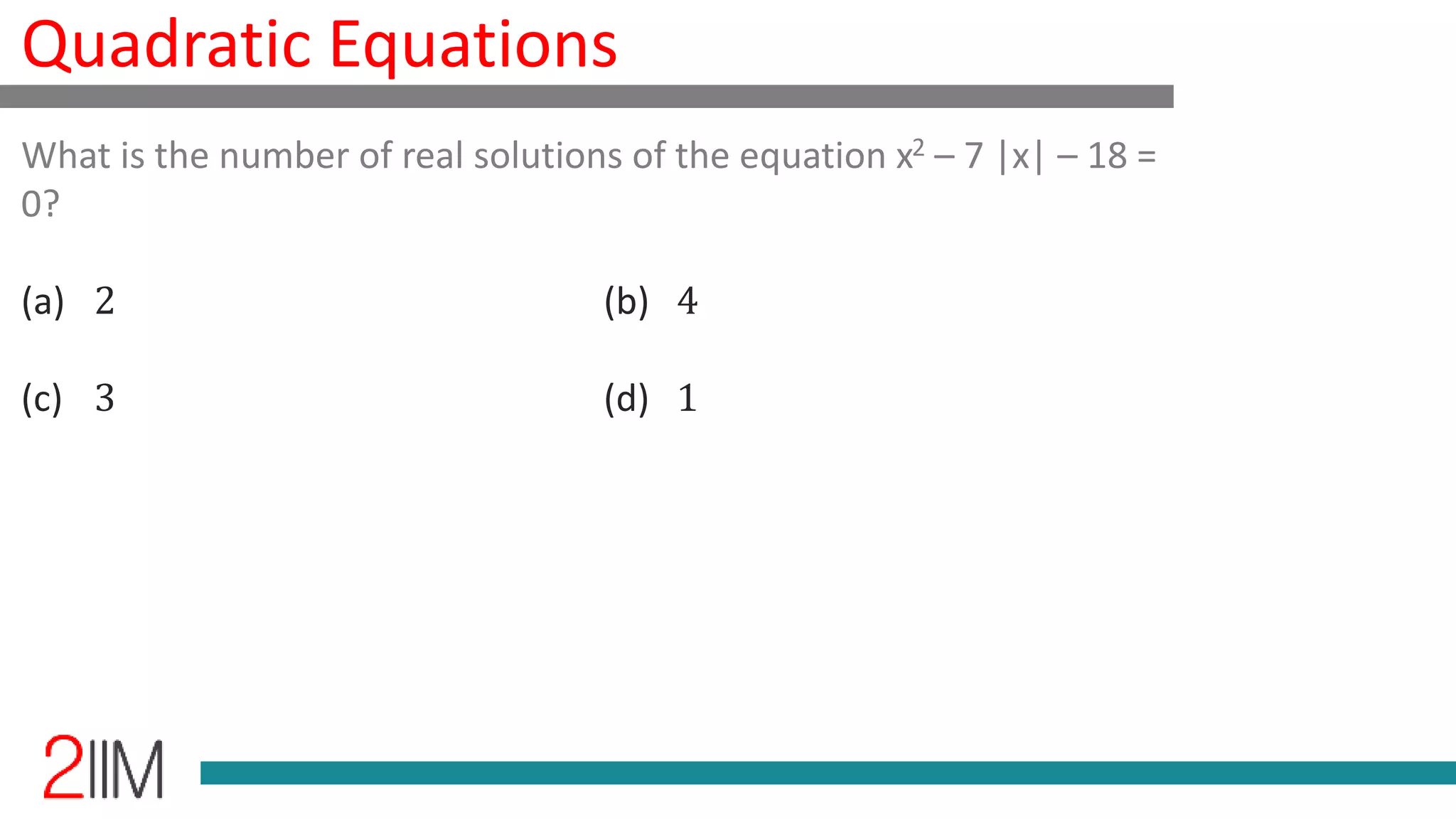 This document discusses solving the quadratic equation x2 – 7 |x| – 18 = 0. It splits the problem into two cases: when x is greater than 0 and when x is less than 0. For each case, it is shown that the only real solution is x = 9. Therefore, the number of real solutions to the given equation is 2, as indicated by choice (a).