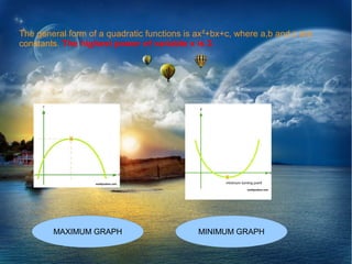 2. The maximum and minimum values can be determined by completing the square, writing the function as a(x + p)^2 + q.