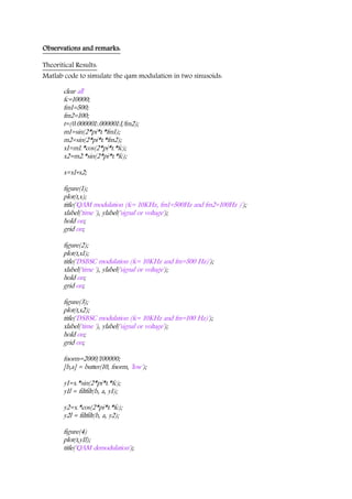 3) Matlab code is provided to simulate QAM modulation and demodulation of signals with different frequencies to demonstrate how QAM works.