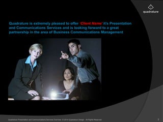 Quadrature is pleased to offer presentation and communication services to 'Client Name' and looks forward to a partnership in managing business communications. Quadrature will manage all aspects of presentations, including structure, graphics, animation, and production to effectively realize client's intended messages. Quadrature's services are designed to save clients' time and energy while producing high quality, on-brand presentations and communications.