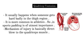 A quadricep contusion is a bruise of the thigh muscle caused by blunt force trauma. It results in bleeding within the muscle. Symptoms include swelling, tenderness, pain, and limited range of motion. Contusions are classified as mild, moderate, or severe depending on factors like range of knee flexion, ability to walk, and average time lost from activities. Treatment involves RICE (rest, ice, compression, and elevation), bracing, NSAIDs, and physical therapy starting with isometric exercises and stretching, then progressing to full range of motion and functional rehabilitation.