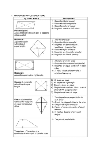 The document defines and describes properties of different types of quadrilaterals. It provides a chart showing the relationships between quadrilaterals and their defining characteristics. Formulas for calculating the area and perimeter of parallelograms, rectangles, squares, rhombuses, and kites are also presented. Key terms related to quadrilaterals such as parallel, perpendicular, diagonal, and symmetry are defined in a glossary.