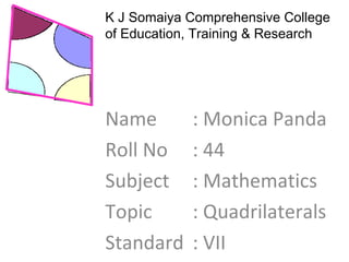 The document defines quadrilaterals and their properties. It states that a quadrilateral is a polygon with 4 sides and 4 angles, and discusses different types of quadrilaterals. It also explains that the sum of the interior angles of any quadrilateral is always 360 degrees, which is demonstrated through an experiment.