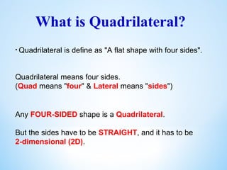 - A quadrilateral is a flat shape with four straight sides. The interior angles of any quadrilateral add up to 360 degrees.