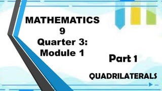 The document provides an introduction to quadrilaterals, defining them as polygons with four sides and describing their types, including parallelograms, rectangles, rhombuses, squares, trapezoids, isosceles trapezoids, and trapeziums. It explains key concepts such as vertices, sides, angles, and diagonals, as well as the properties that distinguish each type of quadrilateral. The material emphasizes the geometric relationships and classifications of quadrilaterals, suitable for learning mathematics.
