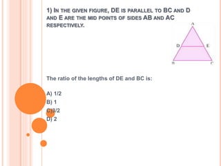 This document contains 10 geometry problems involving properties of triangles, parallelograms, midpoints and ratios of lengths and areas. The problems can be solved using definitions of special line segments and angles in various shapes including triangles, trapezoids and parallelograms.