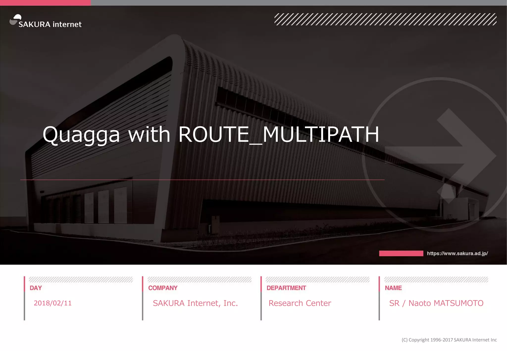 This document outlines the installation and configuration of Quagga with route multipath on a Linux system running Ubuntu 17.10. It includes details on necessary system settings, file permissions, and the setup of relevant configuration files for Quagga components. The document also covers enabling IP forwarding and adjusting network configurations for optimal performance.
