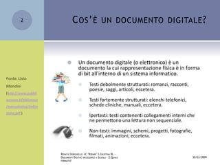 Il documento discute cosa costituisce un documento digitale e la sua accessibilità, evidenziando l'importanza di creare contenuti utilizzabili da tutti, comprese le persone con disabilità. Viene analizzato l'uso di vari formati, come .doc, .pdf, e .txt, sottolineando i criteri per garantire accessibilità e facilitare la fruizione delle informazioni contenute. Infine, vengono fornite linee guida pratiche per strutturare correttamente un documento digitale per massimizzare l'accessibilità.