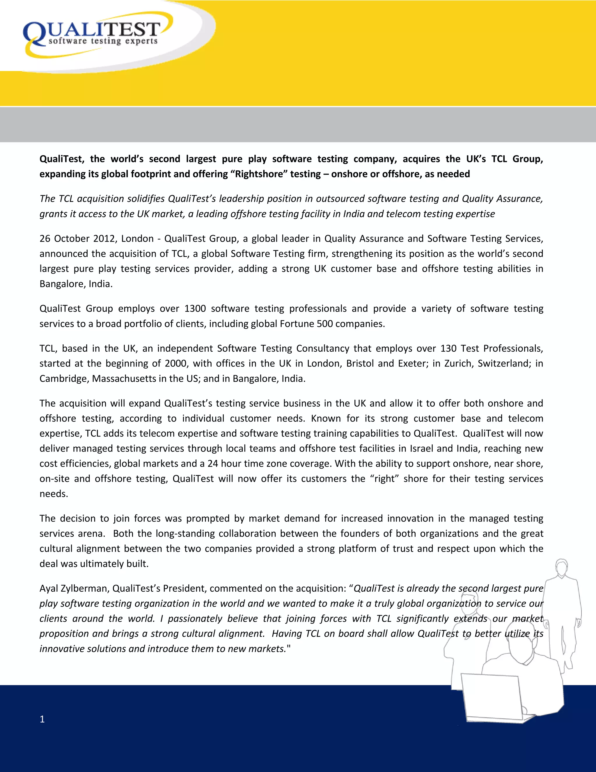 Qualitest, the world's second largest pure play software testing company, has acquired the UK's TCL Group to enhance its global presence and service offerings. This acquisition strengthens Qualitest's leadership in outsourced software testing and quality assurance while providing access to the UK market and telecom testing expertise. With over 1,300 professionals, Qualitest aims to deliver a mix of onshore and offshore testing solutions to meet diverse customer needs.