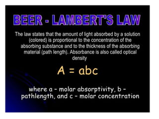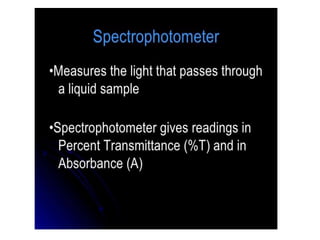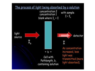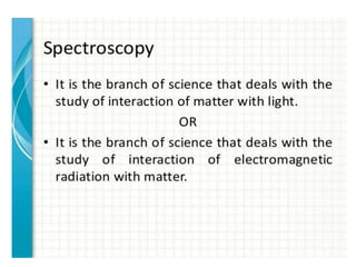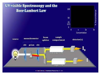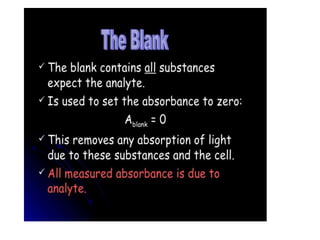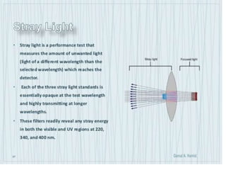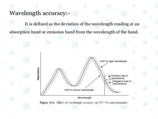 The document discusses the qualification process for UV-Visible spectrophotometers. Qualification ensures instruments are suitable for their intended use and will function properly over time. It involves design, installation, operational, and performance qualification. For a UV-Vis spectrophotometer, key parameters that must be qualified include wavelength accuracy and precision, stray light, resolution, noise, baseline flatness, stability, photometric accuracy, and linearity. The document provides testing protocols for checking each parameter.