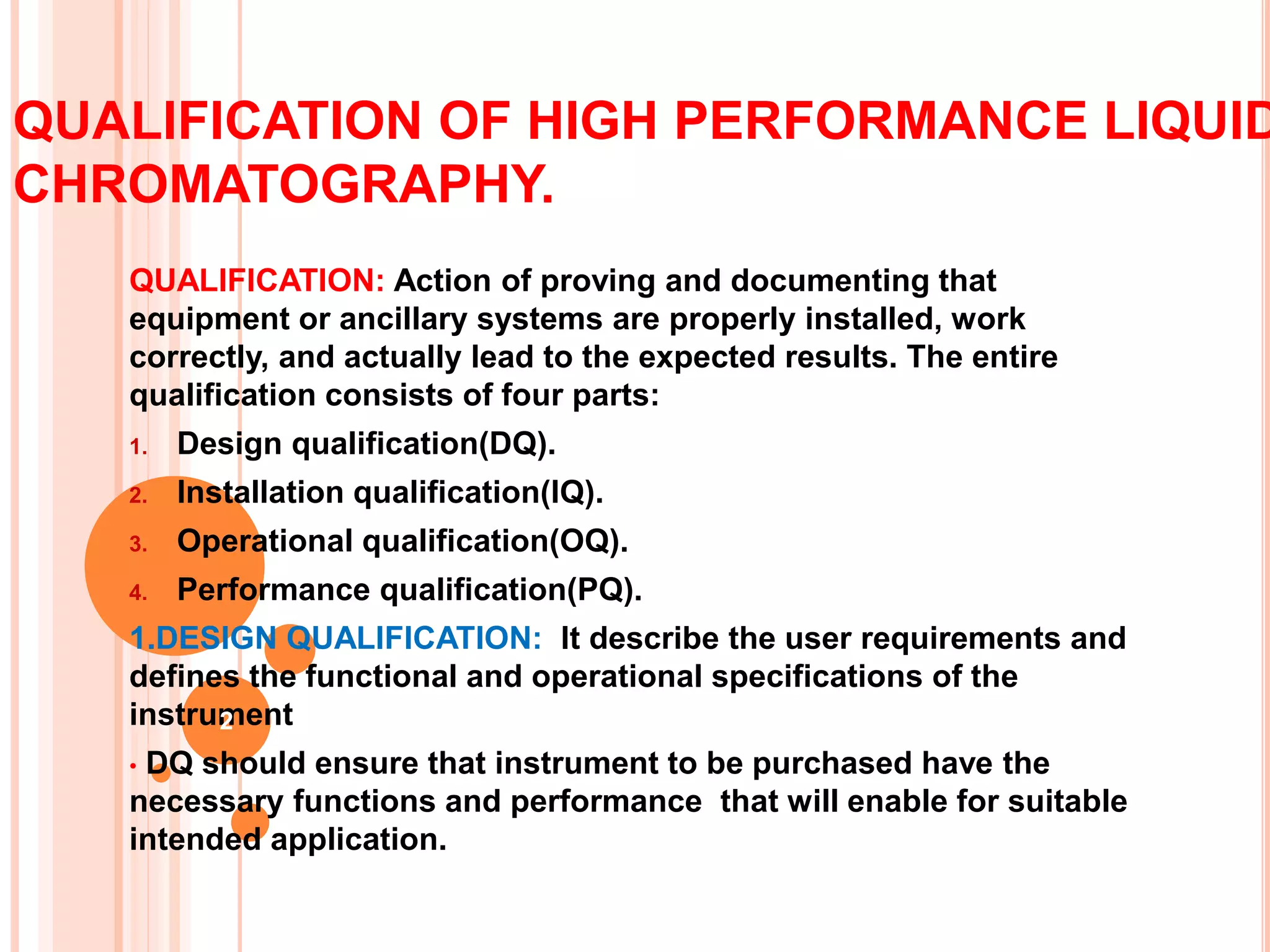 The document provides an overview of the qualification process for high performance liquid chromatography (HPLC) equipment, including design qualification (DQ), installation qualification (IQ), operational qualification (OQ), and performance qualification (PQ). It describes the objectives and procedures for each qualification step. Key aspects covered include verifying design specifications, proper installation, operational requirements such as precision, accuracy and noise levels, and ongoing performance monitoring. The goal of qualification is to ensure analytical systems are suitable for their intended use and generate reliable results.