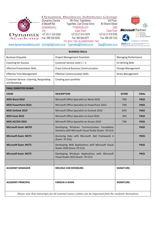 This document is a student report for Etienne Nortje outlining the subjects and training completed as part of an IT Systems Developer programme, as well as final exam results. It details the Microsoft Office, technical, and business skills training attended. It also lists the Microsoft certification exams passed, including MCPD, MCTS, and MOS exams. The report is signed by the Academy Manager and Principal to validate the student's programme completion.