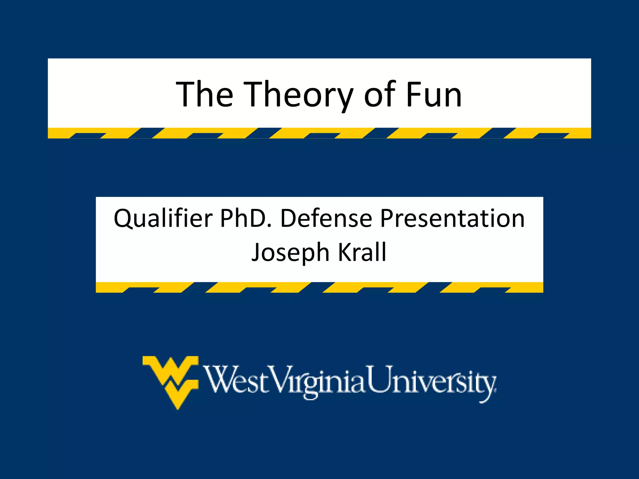 This document summarizes Joseph Krall's PhD defense presentation on his theory of fun in video games. The presentation covered several topics: dimensions of fun including originality, gameplay and story; believable AI; procedural content generation; a theory of fun involving stages of gameplay and maintaining playability and replayability; methods for studying games including surveys; and conclusions about using empirical research and a theory of fun to help game developers create more enjoyable games.