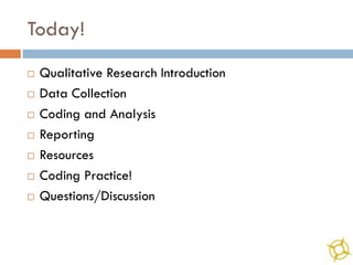 The document outlines a qualitative analysis boot camp focused on various aspects of qualitative research, including data collection, coding, and reporting. It emphasizes the importance of qualitative methods in understanding complex healthcare issues and compares qualitative and quantitative approaches. Additionally, it provides resources and methodologies for conducting qualitative research effectively.