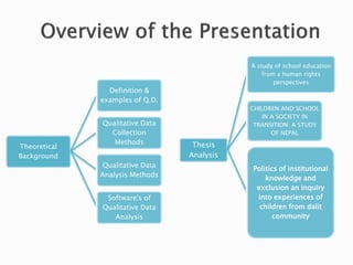 The document provides an extensive overview of qualitative research methods and analysis, particularly in the context of education from a human rights perspective in Nepal. It discusses qualitative data types, collection methods, and various analytical approaches alongside a study aiming to understand educational policies, practices, and experiences of children in a politically transitional society. The analysis highlights the need for human rights integration in educational frameworks and classroom practices to enhance learning and inclusivity.