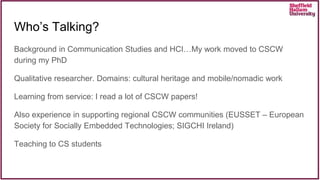 This document discusses qualitative methods in Computer-Supported Cooperative Work (CSCW) research, highlighting their importance in understanding complex human behaviors and interactions within collaborative contexts. It traces the history and evolution of qualitative research in CSCW, emphasizing the shift from traditional lab-centered studies to ethnographic approaches that consider the intricate social and cultural dimensions of work. Key challenges, methodologies, and case studies are shared to illustrate the realities of conducting qualitative research in diverse settings, particularly in light of ever-changing work environments.