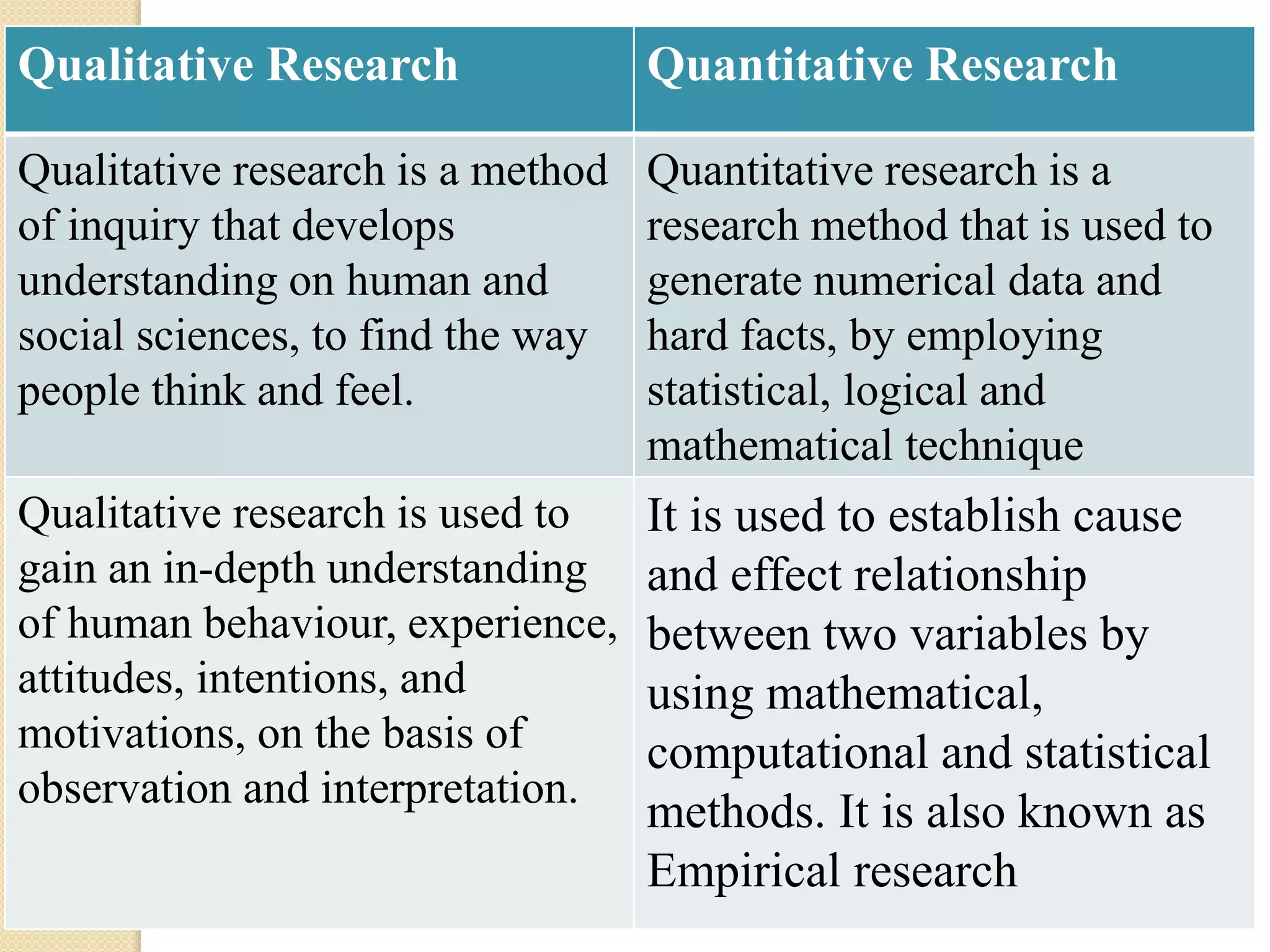 Qualitative and quantitative research differ in their goals, data collection methods, and analysis techniques. Qualitative research aims to understand human behaviors, experiences, and motivations through observation and interpretation of verbal data, using inductive reasoning. Quantitative research seeks to establish relationships between variables and test hypotheses by collecting and analyzing numerical data statistically and deductively. Key differences include qualitative research being exploratory and holistic while quantitative research is conclusive and particularistic.