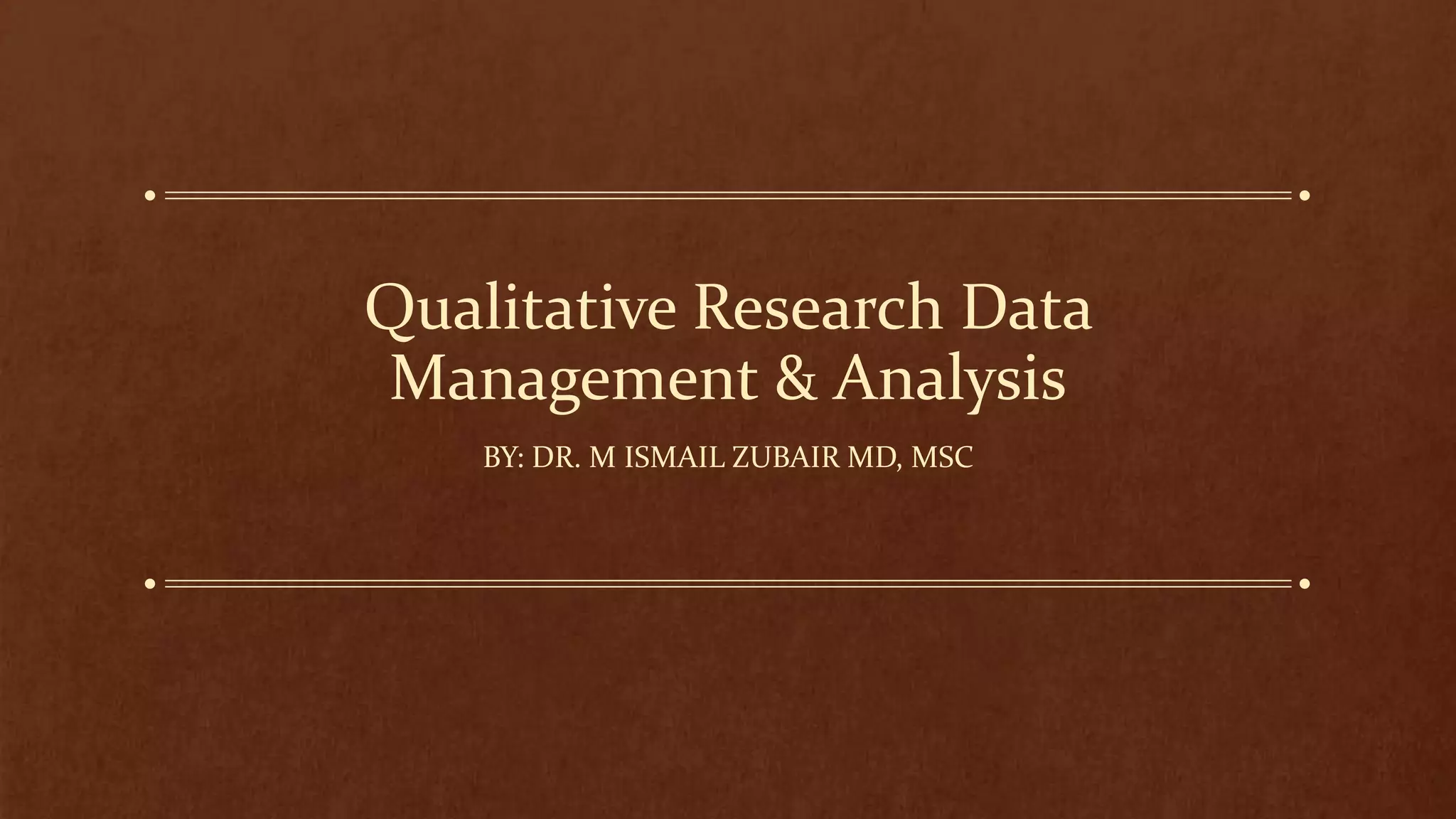 This document discusses qualitative research data management and analysis. It covers topics such as data management, transcription, data analysis, and qualitative content analysis. For data management, it discusses issues like confidentiality, translation, and recording interviews. It describes transcription as translating recordings into written form for analysis. Either researchers or transcribers can transcribe, and digital recorders are commonly used. For analysis, it explains that content analysis is often used and involves organizing data into meaning units, codes, categories and themes to interpret results. Equipment, who should transcribe, and how and when to transcribe are also addressed.