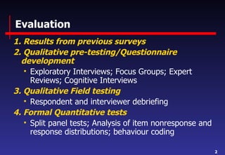 This document summarizes different methods for evaluating survey questions, including qualitative pre-testing methods like exploratory interviews, focus groups, and expert reviews as well as quantitative testing like split panel tests and analysis of response distributions. It discusses the advantages and disadvantages of different evaluation techniques such as cognitive interviews, field testing with interviewer and respondent debriefing, and compares the effectiveness and costs of various methods.