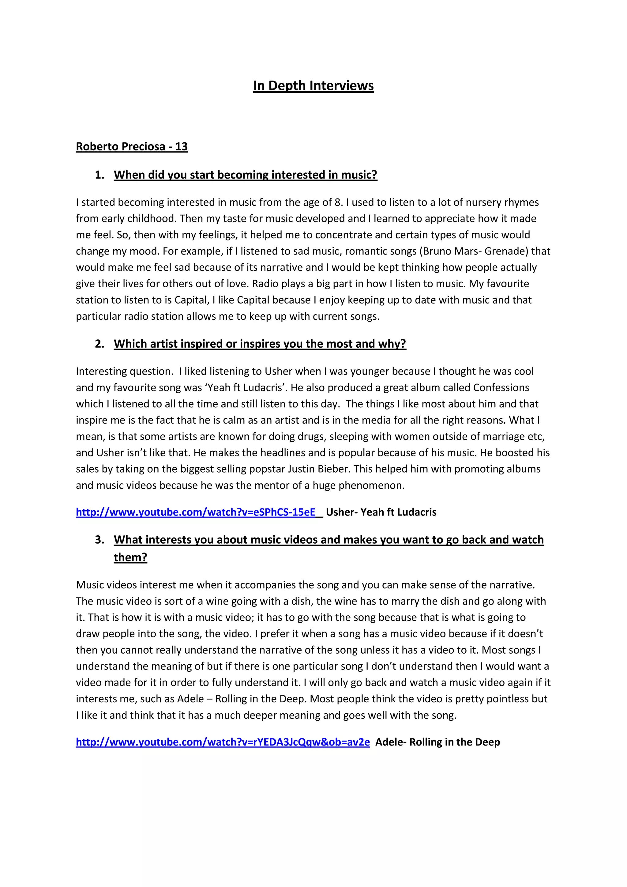 Roberto began enjoying music at age 8 through nursery rhymes and developed an appreciation for how music makes him feel. He enjoys listening to Capital radio and likes how certain songs like "Grenade" by Bruno Mars can change his mood. Usher inspired Roberto the most for his calm demeanor and success due to his music rather than controversies. Roberto prefers music videos that accompany songs to understand their narratives, such as Adele's "Rolling in the Deep". If choosing a song for a video, he would depict the narrative of Adele's "Set Fire to the Rain".