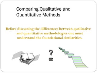 This document discusses and compares qualitative and quantitative research methods. Both approaches can generate and measure data, but differ in their underlying strategies. Qualitative research is exploratory and inductive, using methods like grounded theory, ethnography, phenomenology, and field research to understand phenomena from participants' perspectives. These methods prioritize observation and open-ended interviews over experimental controls. Qualitative research provides rich detail but weaker reliability, validity, and generalizability than quantitative methods. Researchers must consider their goals and the trade-offs of each approach.