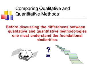 This document discusses qualitative research methods. It begins by noting foundational similarities and differences between qualitative and quantitative research. Specifically, it notes that qualitative data can be coded quantitatively and qualitative inquiries can generate quantitative research. The main difference is that qualitative research is exploratory and inductive while quantitative research is confirmatory and deductive.