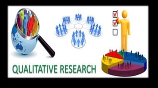 This document provides an overview of qualitative research, including its objectives, definition, strengths, weaknesses, common types (basic interpretive study, phenomenological study, grounded theory study, case study, ethnographic study, narrative analysis, historical research), elements of the research process, appropriate uses, needed skills, common instruments, in-depth interviews, and focus group discussions. The overall purpose is to define and explore qualitative research methodology.
