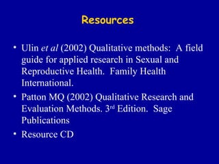 This document provides an overview of qualitative research methods. It discusses different qualitative research designs including case studies, ethnography, grounded theory, phenomenology, and participatory research. It covers sampling strategies for qualitative research, ensuring trustworthiness, and common data collection methods such as observation, document review, and interviews. The goal of qualitative research is to provide an in-depth understanding of phenomena rather than generalizable results.