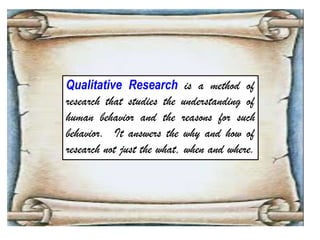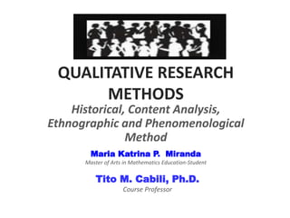 This document discusses qualitative research methods, including historical research, content analysis, ethnographic research, and phenomenological research. It also covers key aspects of qualitative data collection such as observation, interviews, focus groups, and interpreting documents and material culture. The types and purposes of interviews, observations, and focus groups are defined. Validation and reliability of qualitative research instruments is also addressed.