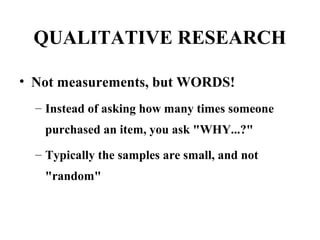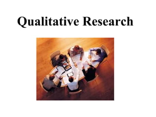 Qualitative research uses words rather than numbers to understand people's motivations, beliefs and attitudes. It typically involves small sample sizes and flexible research methods like interviews and focus groups. Qualitative research is best for understanding problems, testing ideas, and examining feelings and motivations in depth. Though not generalizable, it provides complex insights useful for product development, advertising and messaging. Common qualitative methods include interviews, focus groups, observations and projective techniques like word associations to probe underlying attitudes. Qualitative research requires skilled moderators and complex analysis but yields rich data on people's perspectives.