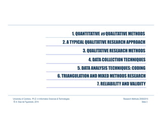 This document provides an introduction to qualitative research methods in information sciences and technologies. It discusses the differences between quantitative and qualitative methods, noting that while traditionally seen as incompatible, they are actually complementary. Qualitative methods are increasingly used in fields like information systems and human-computer interaction due to the complex social and human factors involved. The document outlines some key aspects of quantitative and qualitative research approaches.