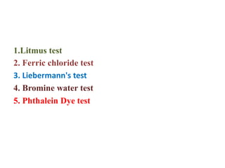 1. Litmus test detects phenol's acidity by changing blue litmus to red.