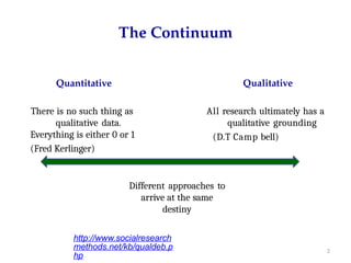 The document presents a comprehensive overview of qualitative data analysis (QDA), including its definitions, methods, and key differences from quantitative research. It outlines various qualitative research designs, data collection techniques, and analytical approaches, emphasizing the importance of context and participant perspectives. Additionally, it discusses software tools that facilitate analysis, highlighting best practices for conducting qualitative research.