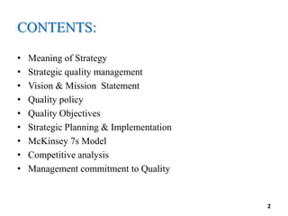 This document discusses quality as a strategic decision for an organization. It emphasizes that adopting a quality management system should be a strategic decision made by top management. Top management must communicate the importance of quality, ensure quality objectives are established, perform management reviews, and provide appropriate resources. The document also discusses developing a quality policy, quality objectives, strategic planning and implementation, and evaluating strategic quality decisions.