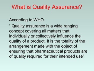 Quality assurance is a wide-ranging concept covering all matters that individually or collectively influence the quality of a product. It aims to ensure that pharmaceutical products are of the quality required for their intended use. Key aspects of quality assurance include providing evidence that quality activities are being performed effectively, ensuring products meet given quality requirements, and initiating actions to dispose of non-conforming products. Quality assurance plays an important role in industries like pharmaceuticals where human safety is critical.