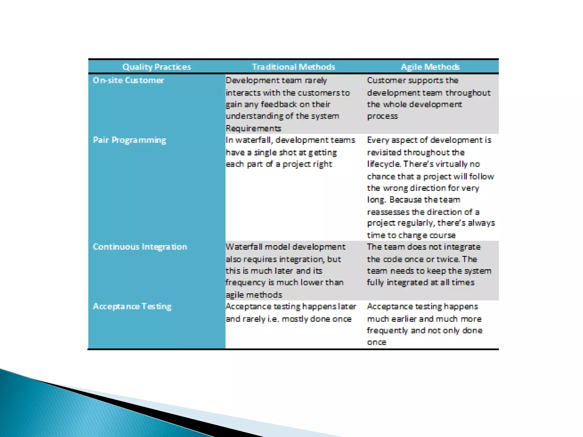 This document compares quality assurance techniques between traditional and agile software development methodologies. It discusses the limitations of traditional waterfall models and agile methods. Traditional methods emphasize well-defined requirements and documentation, while agile prioritizes working software through short iterations with frequent customer feedback. Both approaches aim to ensure quality, but agile relies more on practices like refactoring, test-driven development, and continuous integration throughout the development cycle. In conclusion, agile may better facilitate quality by starting testing earlier and more frequently integrating customer input.