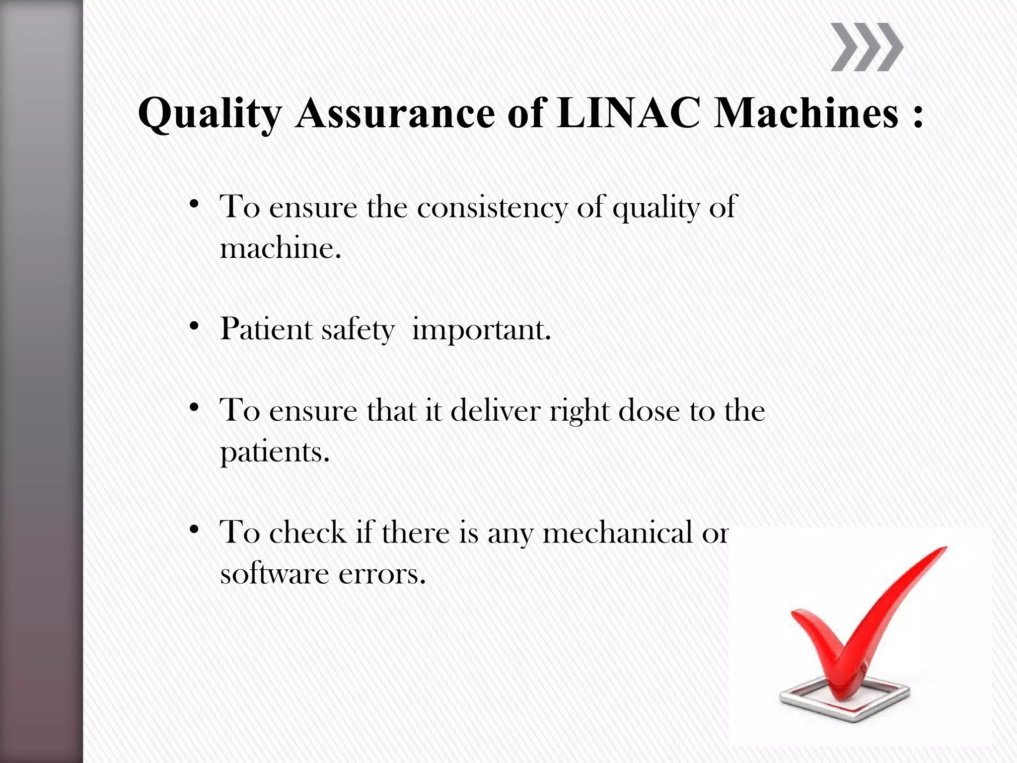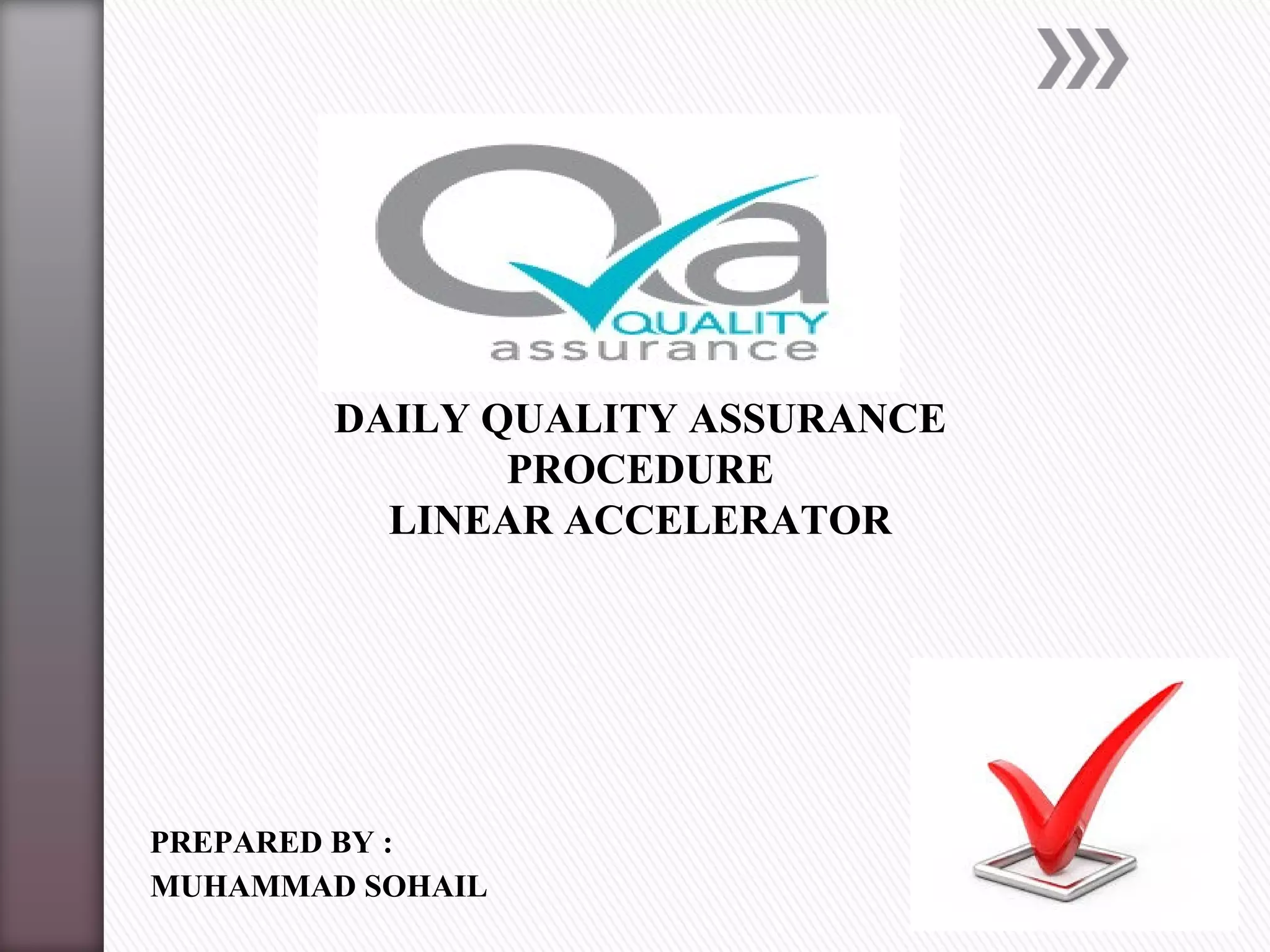 This document outlines the daily quality assurance procedure for a linear accelerator. It describes turning on the machine, performing mechanical checks like gantry and couch movement tests, warming up the machine using various electron and photon energies, and performing dosimetry measurements to ensure parameters are within tolerance levels. Results are documented in a QA sheet for record keeping. The purpose is to ensure consistent machine quality and patient safety by verifying proper dose delivery and checking for any mechanical or software errors.