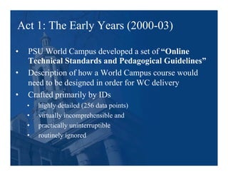 The document outlines the development and implementation of quality assurance standards for e-learning at Penn State University, transitioning from initial technical guidelines to a comprehensive quality assurance framework based on the Quality Matters rubric. Key elements of the standards include course navigation, student orientation, accessibility, and feedback mechanisms. The process involved collaborative efforts across various colleges to ensure adherence to these new quality standards.
