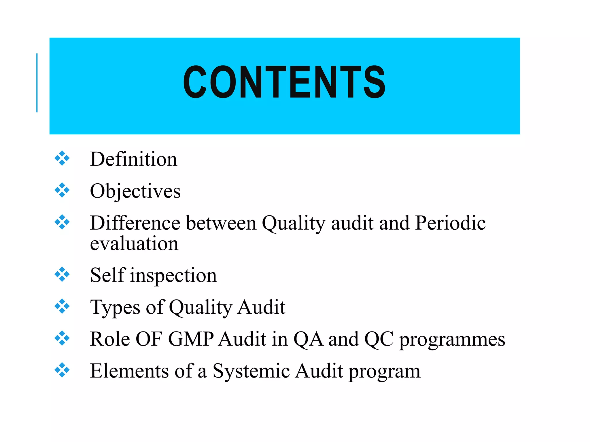 The document provides a comprehensive overview of quality audits, defining them as systematic examinations to ensure compliance with quality standards like GMP. It outlines the objectives, differences from periodic evaluations, types of audits (internal, external, and regulatory), and their purposes in verifying compliance and improving processes. Additionally, it details the roles of different personnel in audits, the importance of auditor qualifications, and the reporting structure for audit findings.