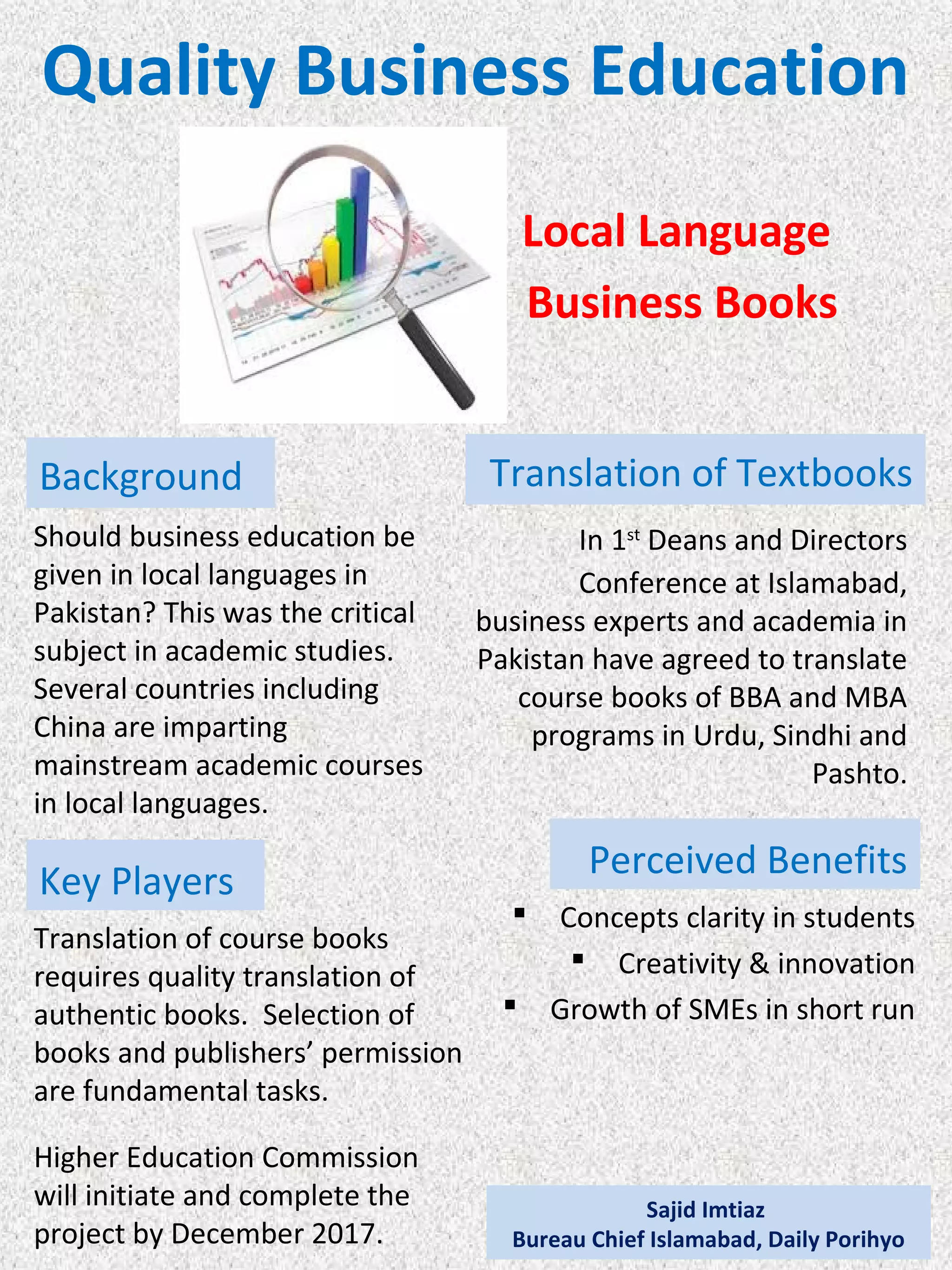 Local business education textbooks in Pakistan will be translated into Urdu, Sindhi and Pashto by December 2014 to improve students' understanding of concepts and spur creativity and innovation, as agreed upon by business experts and academics. The Higher Education Commission will oversee securing publishers' permissions and the quality translation of authentic business textbooks from English to the local languages to ensure students in programs like BBA and MBA fully comprehend course material in their native tongues.