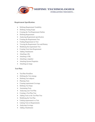 The 3 month Quality Center syllabus covers topics related to test management using HP Quality Center including requirement creation, test planning, test case creation, test execution, defect reporting, and more. The course will provide conceptual explanations, presentations, practical examples, hands-on exercises, and cover topics like managing releases, requirements, test plans, test sets, defects, and reports. The goal is to teach students how to use Quality Center for manual and automated testing as well as defect tracking and test management.