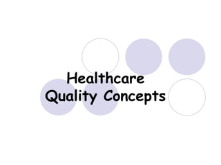 This document discusses key concepts related to quality in healthcare. It defines quality from the perspectives of healthcare providers, recipients, and administrators. It also outlines dimensions of quality including appropriateness, availability, competency, continuity, effectiveness, efficiency, safety, timeliness, and prevention/early detection. 11 dimensions of quality are described in detail which provide a framework for quality management activities. These dimensions include doing the right things, meeting standards, meeting patient needs and expectations, coordination of care, achieving desired outcomes, relationship between outcomes and resources used, respect and caring for patients, reducing risk, and providing timely care.