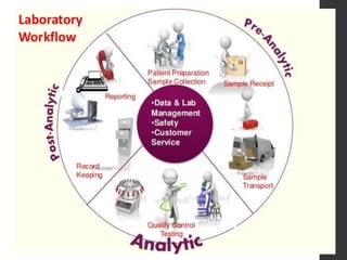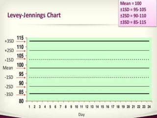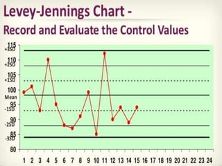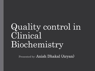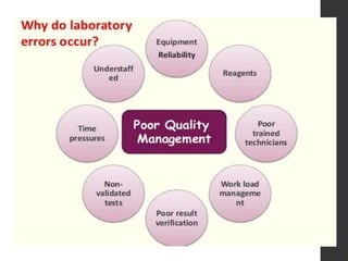 This document provides an overview of quality control in clinical biochemistry laboratories. It discusses that quality control aims to ensure test results are correct by minimizing errors. Errors can occur in the pre-analytical, analytical, and post-analytical phases. The pre-analytical phase, involving sample collection and handling, accounts for most errors. Laboratories use internal quality control methods like calibration, controls, and Levey-Jennings charts daily, as well as external quality assurance programs, to monitor performance and identify errors. Maintaining quality control is important for generating accurate, reliable test results.
