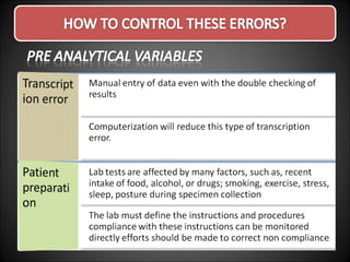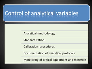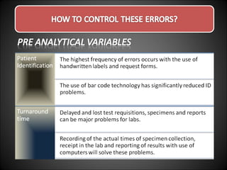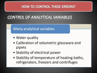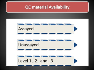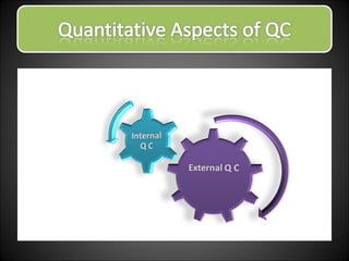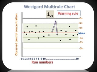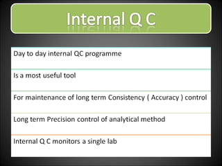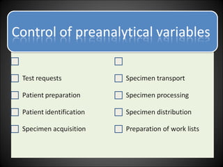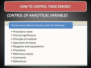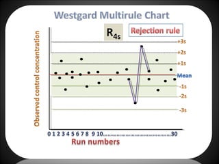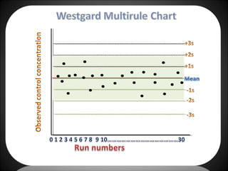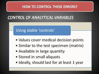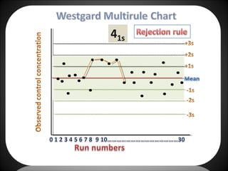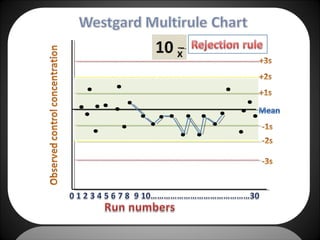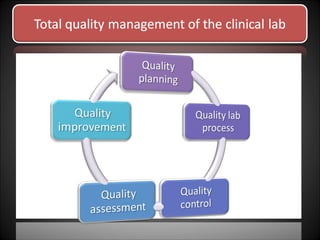 The document discusses the fundamentals of clinical laboratory principles, emphasizing quality control and its importance for effective lab services. It outlines the steps for obtaining laboratory tests, potential errors in lab testing processes, and elements of a quality assurance/quality control (QA/QC) program. Additionally, it covers statistical methods for controlling analytical quality and introduces the CUSUM control chart.