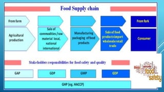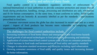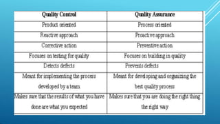 Quality control, quality assurance, and food safety are important concepts. Quality control evaluates final products to assign quality categories, but has limited ability to improve quality. Quality assurance is a planned, systematic approach to provide confidence that products and services will meet requirements. It focuses on how processes are performed. Food safety ensures food will not harm consumers when prepared properly. Responsibilities of quality assurance include ensuring quality policies are followed and products meet specifications. Quality control conducts testing and inspection. Proper control of raw materials, in-process items, and manufacturing variation are important to maintain quality and safety.