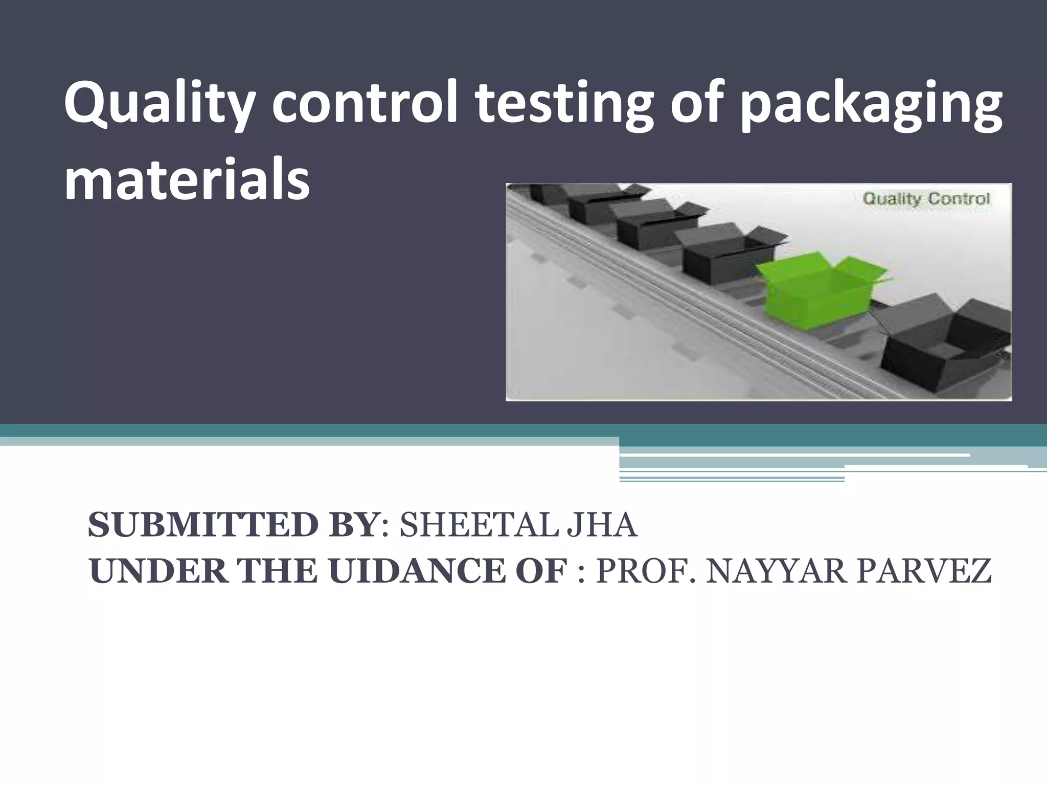 This document discusses quality control testing standards and procedures for pharmaceutical packaging materials. It outlines tests for various packaging components like glass containers, plastic packaging, and rubber stoppers. Key tests described include appearance and dimensional checks, compatibility testing, chemical resistance tests like powdered glass tests and water attack tests, sterility validation tests for sterile products, and non-sterile product validation tests. The document emphasizes that quality control testing is important to ensure packaging and components are defect-free and can safely contain drug products.
