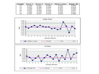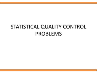 This document discusses statistical quality control using x-bar and r charts to monitor process variations over time, emphasizing the importance of subgroup sizes and control limits. It includes step-by-step procedures for calculating control limits and interpreting charts, along with examples of problems related to quality control in manufacturing processes. It also introduces np, c, and p charts for tracking defects and provides guidance on the creation and analysis of these charts.