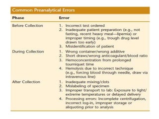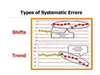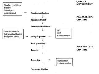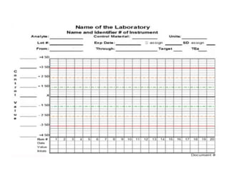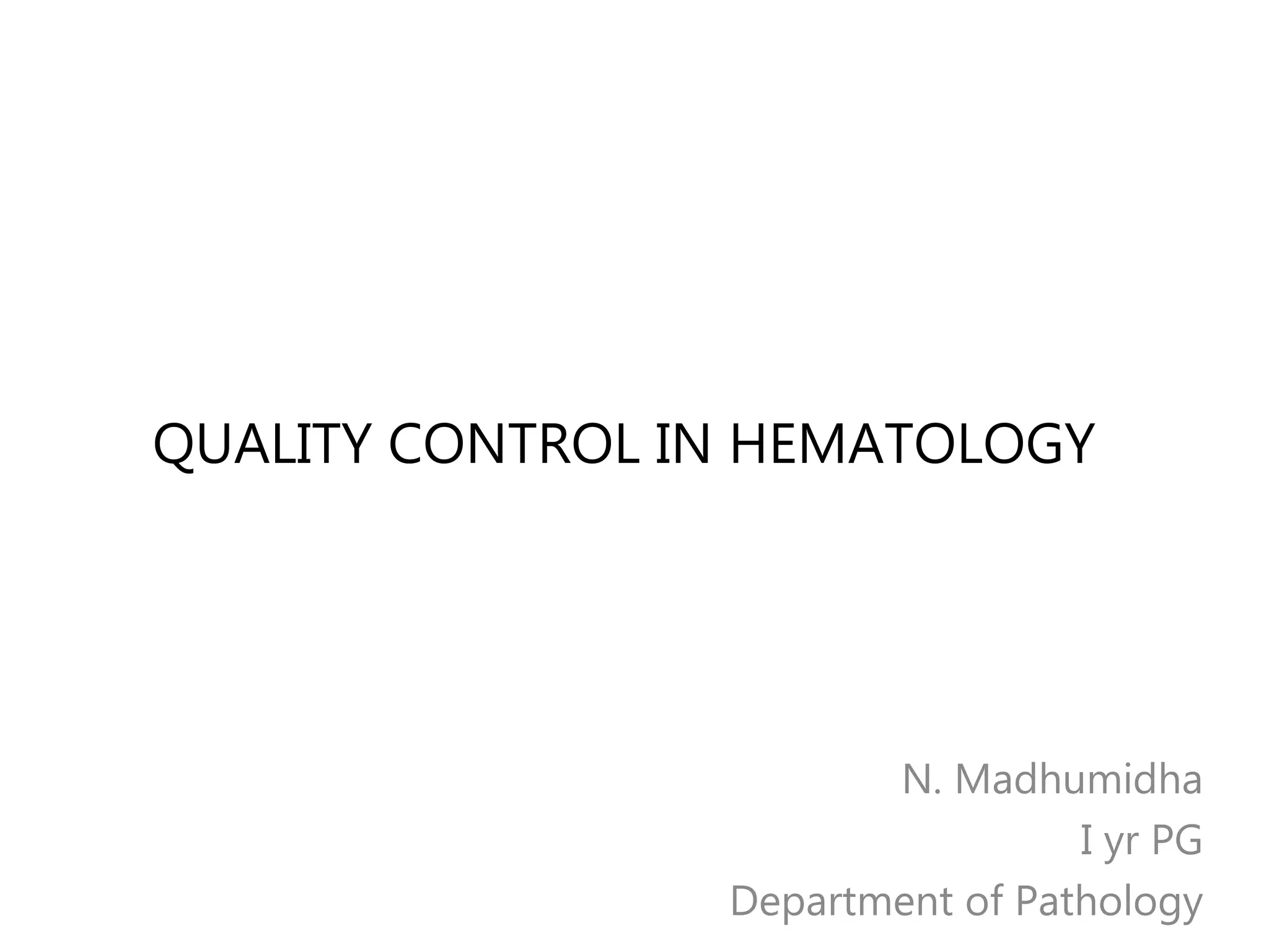 This document discusses quality control in hematology. It defines quality as meeting specifications and quality control as measures taken during testing to ensure tests are working properly. Quality assurance ensures the correct test is performed and the right result is delivered. Quality control involves analytical measurements to assess data quality while quality assurance is an overall management plan. The key activities of quality assurance are preventive, assessment and corrective measures. The document outlines the importance of accuracy, precision, internal quality control, external quality control and corrective actions when errors are found.