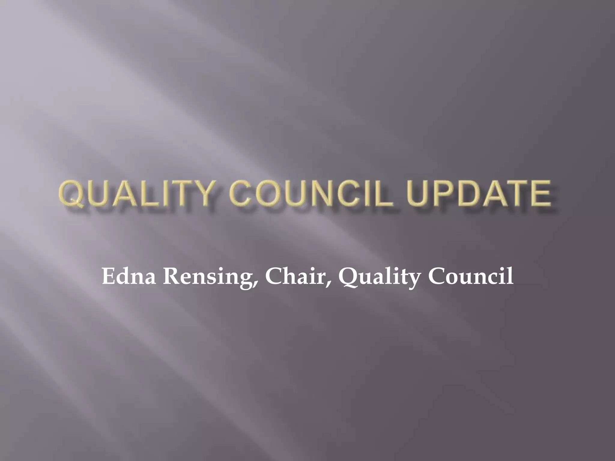 The Quality Council met to discuss progress on their goals of addressing recommendations from the Virginia Rural Health Plan, hosting a rural health quality summit, increasing health promotion programs through community grants, and creating a database of rural health quality data. They reviewed membership, provided training grants to hospitals for staff to attend conferences on chronic disease prevention, and worked to centralize available quality data. Questions remain about the council's role in directly implementing community-based health programs and how to engage communities more in the council's work.
