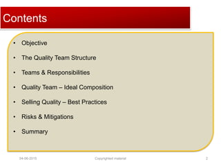 The document provides a comprehensive guide on establishing an effective quality delivery management team, highlighting its structure, composition, and roles. It emphasizes the importance of fostering a quality culture, integrating training, and using strategic metrics for maintaining quality adherence and improvement. Key aspects discussed include process definition, effective facilitation, and the integration of quality practices into business processes.